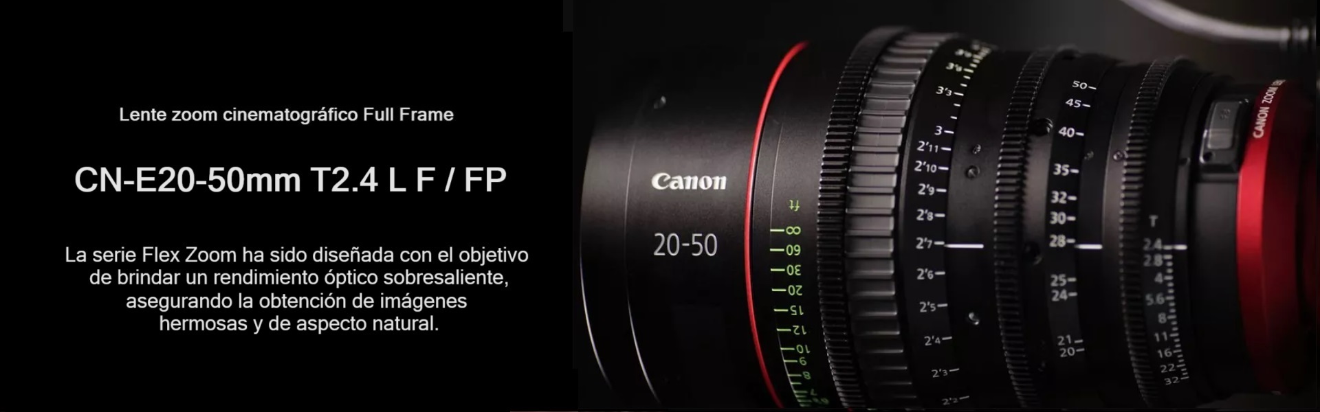 Con una transmisión de luz uniforme de T2.4 en todas las longitudes focales del zoom, la serie Flex Zoom ofrece una amplia longitud focal desde el gran angular del CN-E20-50mm T2.4 L F / FP hasta la longitud focal media del CN-E45-135mm T2.4 L F / FP. Estos objetivos son el complemento ideal para cubrir una amplia variedad de situaciones de grabación.