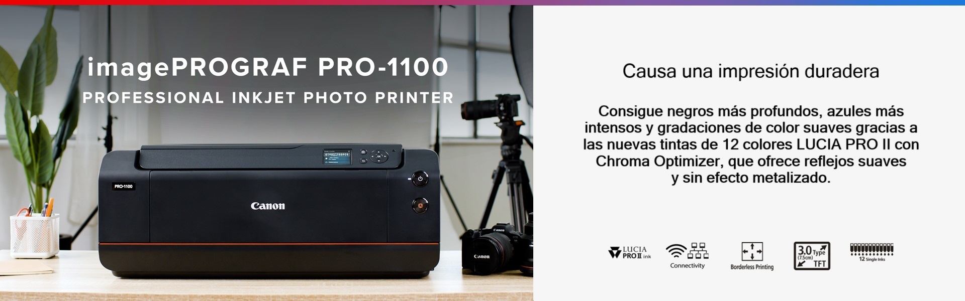 La PRO-1100 es compatible con Sistemas operativos Windows y OS, así como con Android, iOS y ChromeOS. Cuenta, también, con conexión USB, Wi-Fi y Ethernet. Además, puede usarse con AirPrint, Canon PRINT App y Mopria PRint Service, para imprimir tu fotografía desde casi cualquier dispositivo móvil.